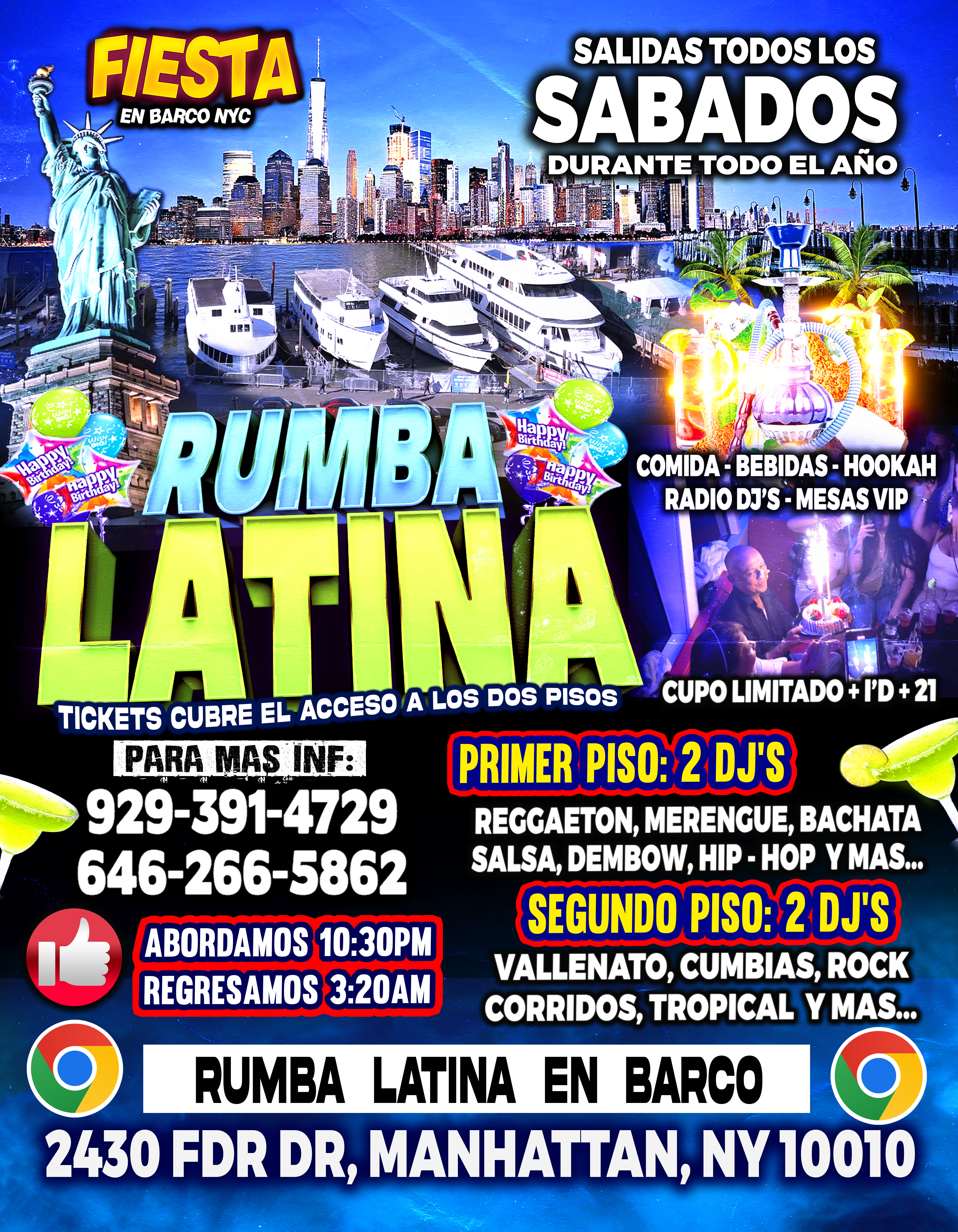 | Where: | google: RUMBA LATINA EN BARCO - DJ ESCANDALO 2430 FDR Dr, New York, NY 10010, MANHATTAN, NY, 10010 |